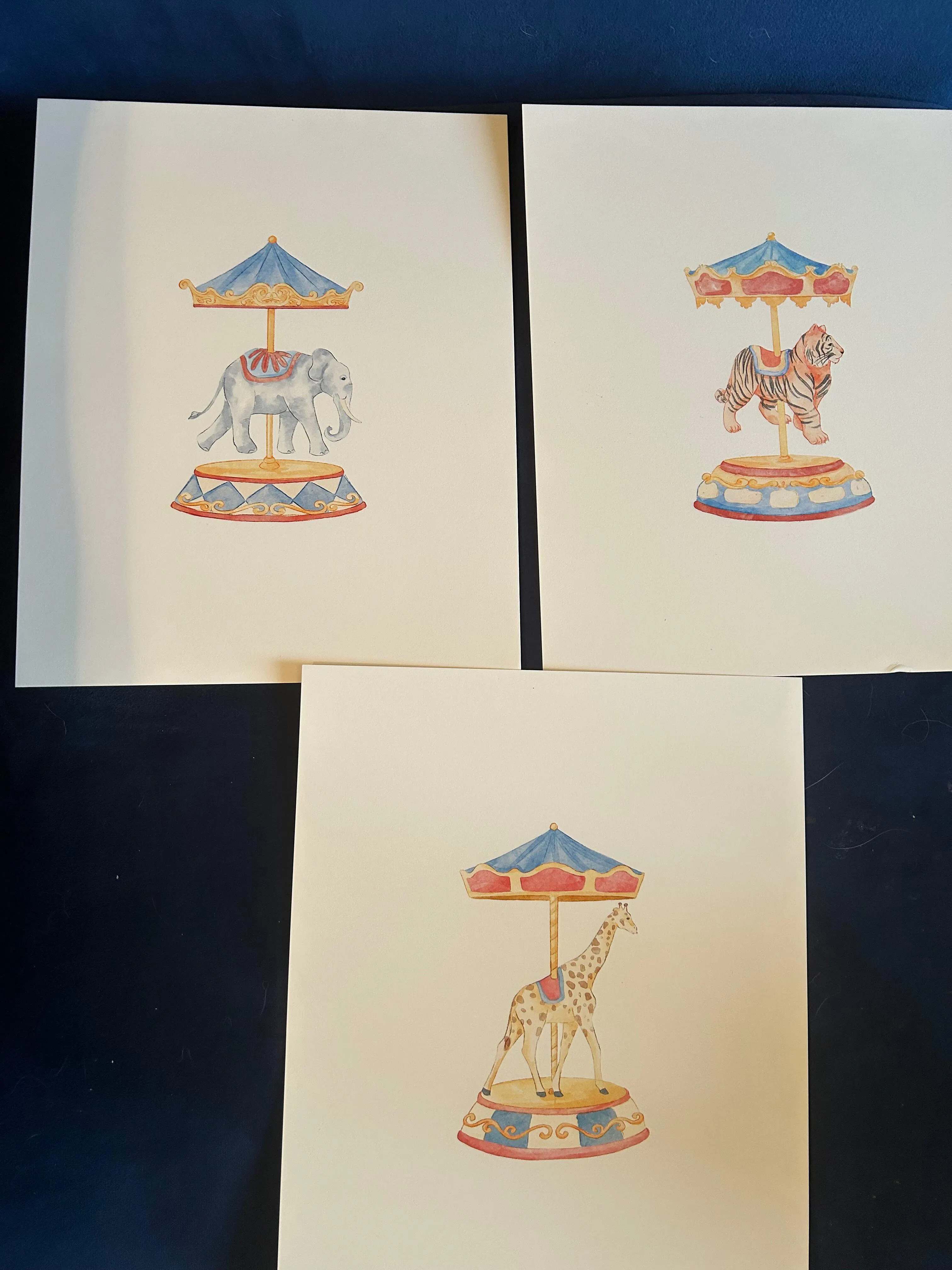 Carousel Animals Watercolor Nursery Wall Art Print Set - 3 Unframed 8x10